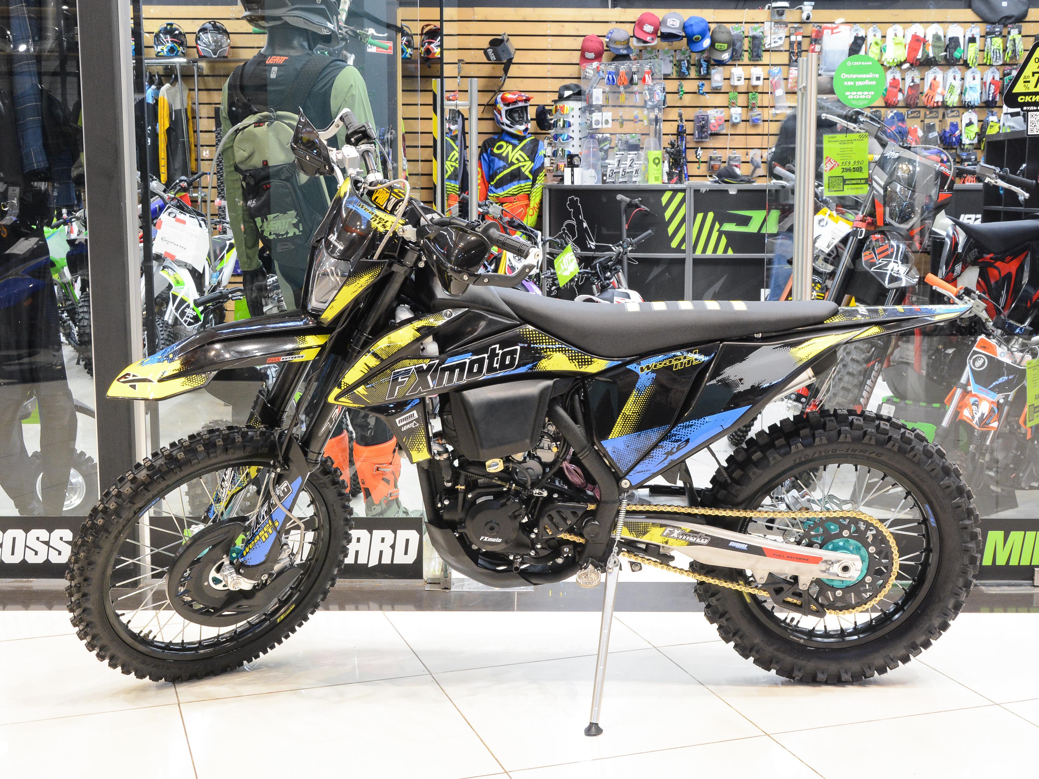 Двигатель у мотоцикла FXmoto WEASEL (NC300S) 300 CC - ZONGSHEN ZS NC300S (два распредвала), водяное охлаждение и 6 скоростей. Для удобства эксплуатации оборудован электро и кикстартером. Амортизаторы перед: NTS (копия KYB) двухкамерные. Перевернутого типа полностью регулируемые, 940мм -54/60 Ф48 Ход 270 мм. Задний NTS (копия KYB). Полностью регулируемый с бачком, 480 мм - поршень Ф40, ход 110. Обода перед : 21" -7116 усиленные UNISON ALUMINUM RIM. Задний : 18" - 7116 усиленные UNISON ALUMINUM RIM. Защита радиаторов алюминиевая. Вентилятор охлаждения PANASONIC. Антибуксаторы на колесоах. Глушитель алюминий (копия FMF). Труба с резонатором (нержавеющая сталь). Звезды перед/зад 13/51- 520 CNC. Рычаг КПП анодированный алюминий. Педаль тормоза алюминиевая - регулируемая. Цепь NIBBI 520 HIGH-END (усиленная). Руль: алюминий 7075 сечение 28/22 и подушка руля. Рычаги сцепления и тормоза складные 3 положения. Ручка газа NIBBI и защита рук армированная с алюминиевой вставкой. Карбюратор NIBBI FCR36. Воздушный фильтр NIBBI. Бак увеличенный черный 10,5 литра. Сиденье рефленное. Траверсы CNC и маятник CNC алюминий 6061. Прогрессия полностью алюминиевая CNC. Армированные шланги тормоза перед и зад. Шины перед/зад CHAOYANG 80/100-21 110/100-18. Защита переднего тормозного  диска. Спицы у мотоцикла усиленные перед/зад 3,95 мм / 4 мм. Подшипники полностью Тайвань. Фара 5 диодов+ходовые огни. Цифровой спидометр и щиток номера. Защита двигателя с боковинами пластиковая. Защита рамы, высота по седлу 940 мм. Размеры L×W×H (mm): 2200 x 940 x 1300 мм.